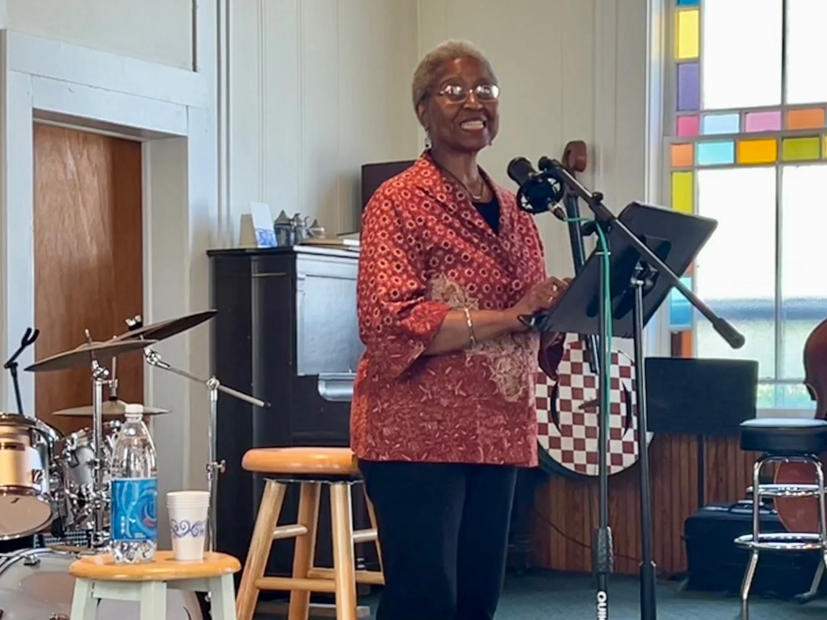 Poet Laureate of Tompkins Country, Janie Bibbie, reading at The Verb Takes a Walk - Poetry Meets Music series.